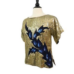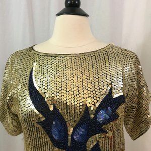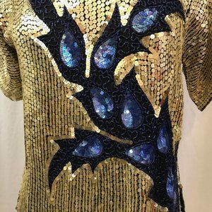 Vintage 1980s Sequined Flapper Style top. Gold and blue sequins on black silk. Straight tunic cut with side slits at hip and dolman short sleeves. An abstract deco style design to the decoration giving it a 20s feel. Label is "Papillon, 100% silk, hand crafted in India. Marked a small but also needs to pull on so please go by measurements below. Aa is, see below