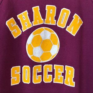 Retro “Sharon Soccer” sweatshirt in burgundy and mustard. Very good condition. Vintage size L Large, 42-43.