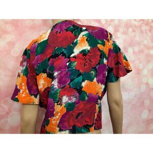 * Vintage 80's Carole Little short flutter sleeve floral faux wrap top, size L