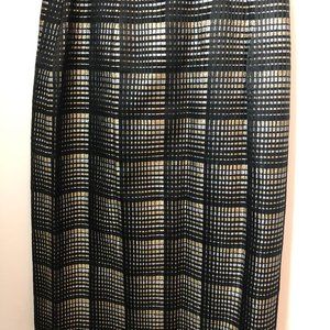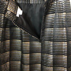 Vintage Christian Dior suit in impeccable condition black/gold/metallic two-piece, checkered pattern. One button blazer with two front pockets. Form-fitting, flattering Pencil skirt with zipper in the back. Size 8