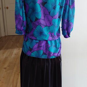 80's vintage dress with teal and purple floral pattern on top with 3/4 length sleeves with cuff on bottom.