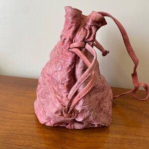 This bucket bag has a draw strap closure, unlined suede and one pocket inside