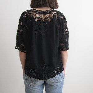 Sweet 1980s black crochet-lace top, the crochet-lace is on the sleeves, top and bottom of the shirt. There is no label, but the material feels like cotton. Measurements taken lying flat (double for approximate full measurement) Chest (pit to pit) 22", Waist 21.5", Hip 20.5", Length 22". This material has a small amount of stretch.IN great vintage condition, no flaws to note. Fit sizes XS-M/L.