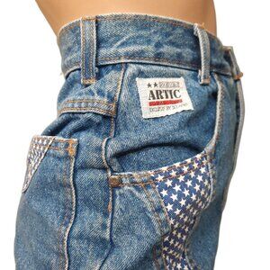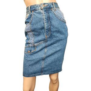 Vintage 80s Denim Pencil Mini Skirt High Waisted Womens XS Blue Star Print