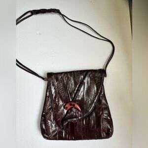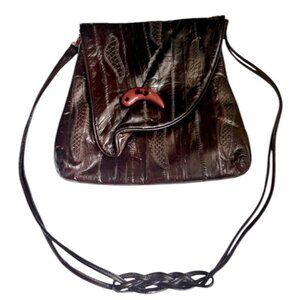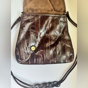 Vintage 80s Eel Skin Leather Snake Print Suede Shoulder Bag Brown Tote Button