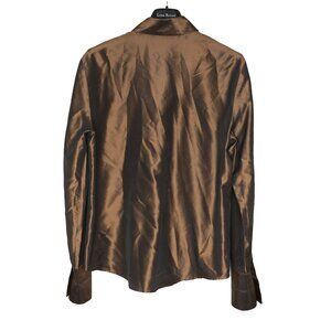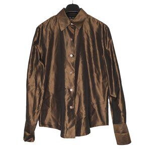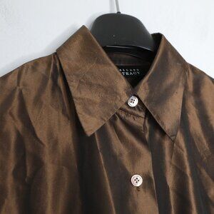 Vintage 80s Ellen Tracy Silk Button Down Collared Shirt Metallic Sheen Brown