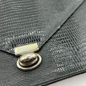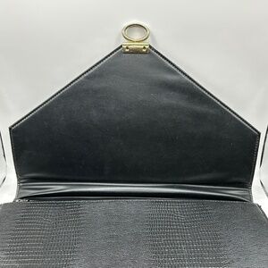 Black patent leather rigid purse with gold handle and latch closure. In addition to the handle, there is a strap that can be hidden inside the bag. A knot was tied in the strap which now retains this shape. One large compartment with a zip-closed pocket.