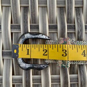 This Vintage 80s Tapestry Waist Belt in size L features a floral pattern and a boho chic style, perfect for those who love the hippie, granny, western, southwestern ranch life and cottagecore aesthetics. Made from faux leather, metal, and fabric, this multicolor belt is accented with silver beading and embroidery, adding a unique touch to any outfit. The distressed silver metal hardware ensures durability, while the adjustable design makes it versatile for various waist sizes (31-35 inches). With a retro and nature-inspired theme, this belt is a statement piece that captures the essence of the 80s and beyond.