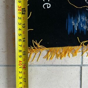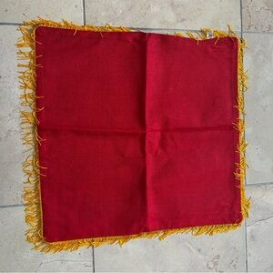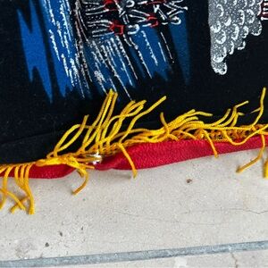 Colorful Florida-themed pillow cover with intricate transfer details. Features vibrant designs and fringe detailing. Has a very faint musty odour but some fabric freshener and/or a good soak would do wonders. This can also be used as a wall tapestry. Great to add to any man cave, she shed or sun room or take to your Florida winter get away!
