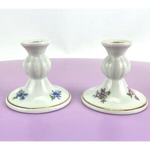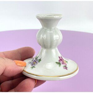 lovely set of vintage East German candle holders, sold as a pair. Porcelain with delicate floral pattern, each candle holder has a different pattern yet similar in style. Would hold a candle with a diameter of 0.5"