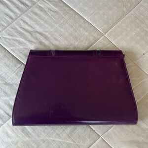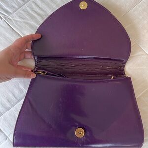 This vintage-style shoulder bag features a bold, structured silhouette with a rich purple leather exterior.