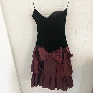 Vintage 80s Gown Strapless dress Black Velvet Velour Dark red iridescent skirt S