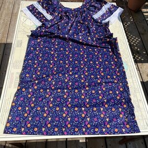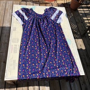 Vintage 80s Hamilton blue floral lace trimmed house dress / muumuu. Very good used condition, though seams at armpits have come loose. Tagged as 100% polyester, medium. Measures 23" pit to pit, 22.5" waist, 24" hips, 48" long.