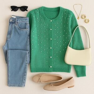 Vintage 80s Hand Knit Green Pearl Embellished Elegant Twinset S/M