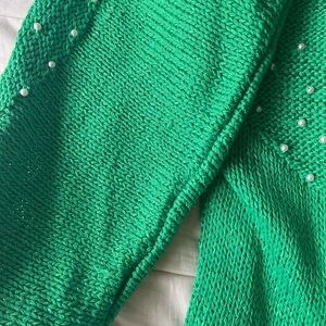 Vintage 80s Hand Knit Green Pearl Embellished Elegant Twinset S/M