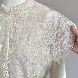 Beautiful, cream coloured, “Winter White” sweater with lace, pearl, sequin overlay / bib. Has a total Victorian vibe!