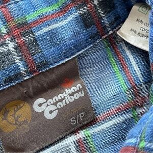 Vintage 80s JP Hammill & Son Canadian Caribou Plaid Pearl Snap Shirt in size small. This button-up shirt features a classic collared neckline with long sleeves and a regular fit, perfect for a timeless western or outdoor look. Made from a durable polyester and cotton knit fabric, this shirt showcases a unique multicolor plaid pattern with button accents, giving off a retro 70s and 80s vibe. Easy to care for and suitable for all seasons, this vintage piece is a must-have for any Canadian cottage or cowboy-inspired wardrobe. Good preowned condition, no holes or stains.