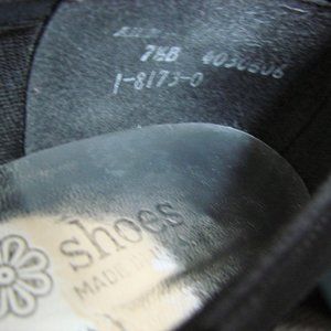 - They feature a black satin fabric with a rosette flower with black beading on the top toe part of the shoe.