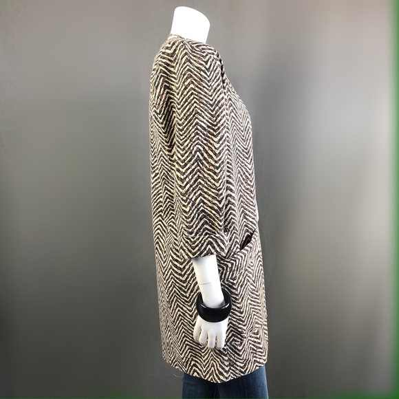 A fun neutral print lightweight blazer/ sport coat. No front closure, pockets, unlined. Shoulder pads can easily be removed. Cotton blend, hand wash. Light wear, one minuscule mark on left front shoulder (see photo) Tagged size 7.