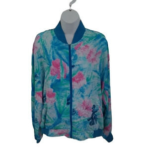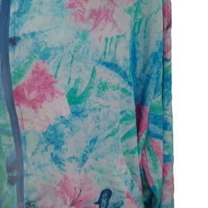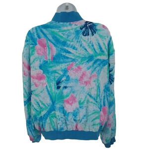 Fabulous straight from the 80's vintage coat. Lightweight polyester fabric. Pastel foliage and hibiscus flowers. Blue zipper, collar and cuffs. Loose, boxy fit. Kind of coat that had shoulder pads. Dropped shoulder seam. Wrinkle resistant. Two functional front pockets.