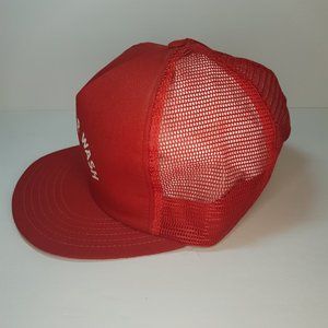 Tags: One size, baseball hat, baseball cap, Dad hat, farmer hat, trucker hat, snapback, snap back, red, white, 1980s, 80s