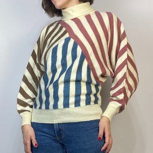 Vintage 80s cream white sweater with rose, brown and blue stripes! Love the slouchy cut with batwing sleeves, turtle neck and fitted waist. By "Clothes to You."
