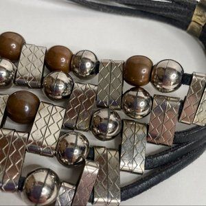 Vintage 80s Rock Punk Vibes Metal Pieces Belt. Triangular Geometric shape to the front with metal squares and round balls. Leather strap with multiple strands twisted together on the sides. Adjustable fit. Buckle closure. Fantastic Vintage condition. Still lovely and shiny, no tarnishing and the leather also really nice. This would look great over a vintage sweater or even a little black dress😍 Size Small. Measurements in photos. Made in Italy.
