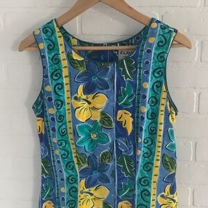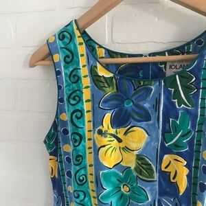 Vintage 80s Mini dress Beachy Tropical Paisley Floral Aloha Print Blue/Yellow S