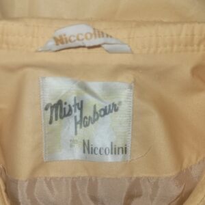 "Misty Harbour" by Niccolini brand. Has a rounded style collar with button front closure and hidden button placket. Shoulders are padded and comes with matching fabric belt. Has 2 side pockets.