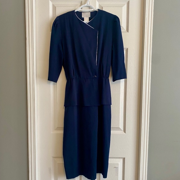 Gorgeous and versatile 80s peplum dress with an ode to sailor / nautical fashion. Size 7/8 or medium. Waist is stretchy and fabric is composed of 80% polyester and 20% acrylic.