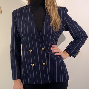 The year is 1985. You just showed up your male colleagues by landing that huge promotion you were all vying for. To celebrate, you treat yourself to this blazer: a navy pinstriped powerhouse with domed gold buttons & just the right amount of shoulder structure. On your way home from the mall, a Pat Benetar song come on the radio. You turn it up. Life is good.