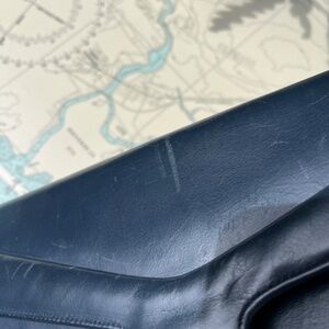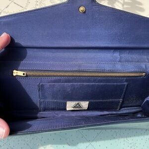 Vintage 80s navy hand bag / clutch / purse made by Victory Handbags in Toronto. Unsure if it's leather or vinyl, no tag indicating materials. Shows a few scuff marks, see photos, otherwise in nice condition. Measures approx. 11.75" x 4.75" x 1.5".