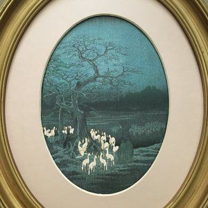 Vintage 80s Oval Frame and Mounting With Hokusai Kitsune Print