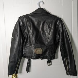Vintage 80s PRASUCO Leather Motorcycle cropped Jacket. It has so many studs, metal appliques and embossing it's hard to see all the cool details all at once.