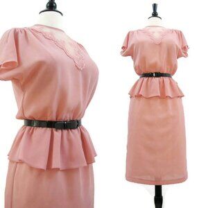 Dusty rose pink polyester crepe day dress with lace inset at neckline. Ruched at shoulders with flutter sleeves. Elasticized waist and flared peplum with straight skirt. Back button, unlined and semi-sheer - will need a slip. (belt not included) Please go by measurements below to determine if this will work for you