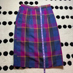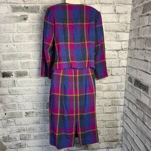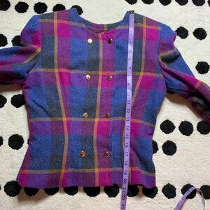 This Vintage Plaid Wool Double Breasted Blazer Skirt Set is a unique, handmade piece perfect for various occasions such as travel, business meetings, office, weddings, parties, casual outings, formal events, and workwear. The set includes a skirt and jacket in a flattering size x-small, made from lightweight and lined wool fabric in a beautiful purple pink yellow and blue plaid pattern. The blazer features a double-breasted gold button front with an eight-button style, long sleeves, and a regular fit. This suit skirt set exudes a vintage charm with a hint of retro and preppy styles, making it a versatile and stylish addition to any wardrobe.