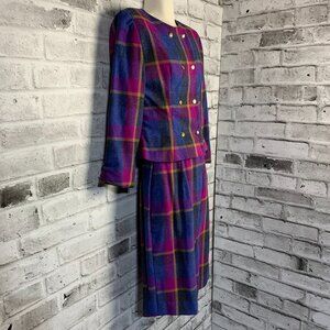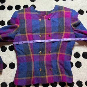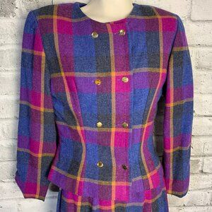 Vintage 80s Plaid Double Breasted Blazer Skirt Set Small Purple Blue Handmade