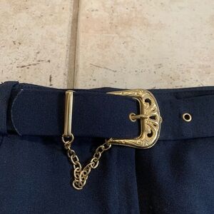 Elevate your vintage collection with this beautiful and unique skirt from the classic Canadian brand, Principles. This Principles Petite skirt is a rare find, featuring a chic and flattering midi length and a timeless design. The standout detail is the integrated gold-tone buckle belt with a delicate chain accent, adding a touch of elegance and interest.