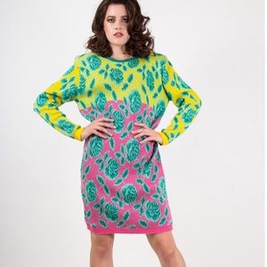 Totally awesome vintage 1980s 'punk label' Betsey Johnson (before her super popular Betsey Johnson brand that we know from the 90's/00's) sweater dress. Bright bold knit quadrants in yellow, pink, purple, and peach with intarsia knit roses Betsey is famous for. Comfy cotton knit, rib crew neck, long sleeves and attached shoulder pads, long tunic style fit.