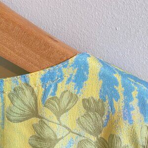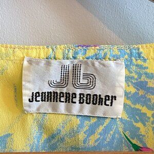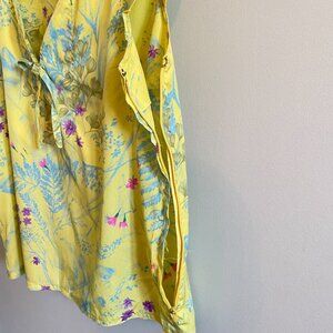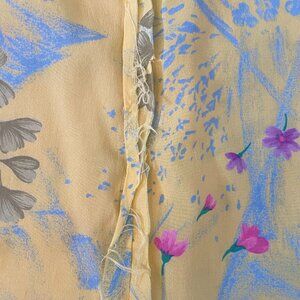 Vintage blouse from the 1980s by Jeannene Booher. Fabric is lightweight, slightly sheer with no stretch. Yellow with blue, pink and green floral print. Short, fluttering cap sleeves. V-neck slit with hanging ties. Wire clasp and hidden zipper on one side of the bodice. The print is on both sides of the fabric and there are two layers of fabric on the upper half of the top. Romantic, feminine, floral, whimsical, summer top.