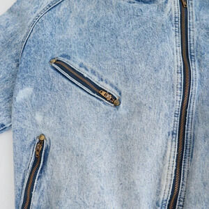 Vintage 80's Silver Denim Acid Wash Zip Up Biker Style Jacket Size Medium
