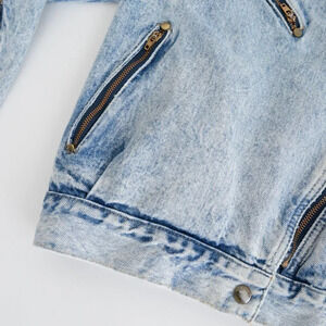 Rev up your style with the Vintage 80's Silver Denim Acid Wash Zip-Up Biker Style Jacket, available in a size Medium. This iconic jacket seamlessly blends retro charm with the edgy aesthetic of biker style, capturing the essence of 80s fashion.