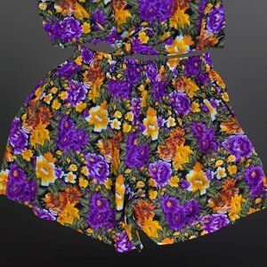 * Vintage 80's rayon bright floral print tie front blouse and shorts set, size M