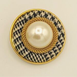 Gorgeous large statement earrings with central pearl like cabochon and tweed and gold metal surround. Clip on.