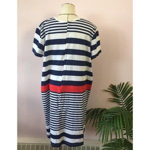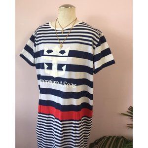 Super cozy soft knit navy blue red and white striped cotton t-shirt dress, small back zip, lots of stretch but looks best oversize. Cream puffy-printed anchor and branding across the chest, 80s cruise logo "Sovereign of the Seas." Really comfortable but also striking piece, very well made.
