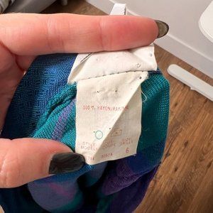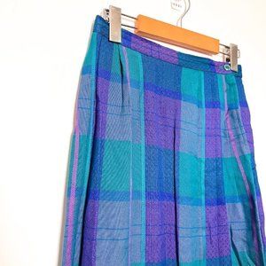 How cute is this skirt! A-line fit, a little above midi length. Plaid with great blue and teal colouring. Would fit at smallest part of waist.