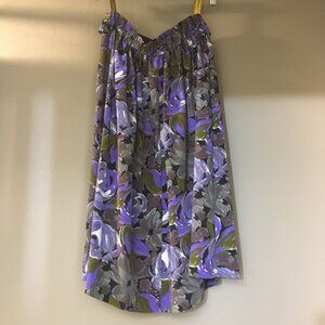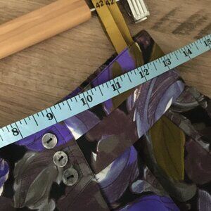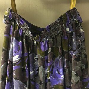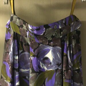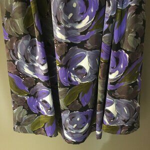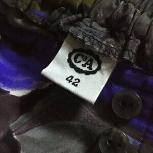 Very good preowned condition, C & A Union pleated skirt with decorative button front and ruched back waist featuring large purple rose print. Long, flowy, mature, summery and in great shape. C&A was founded in 1841 by two brothers, Clemens and August. This one looks like it's probably from the 80s.
