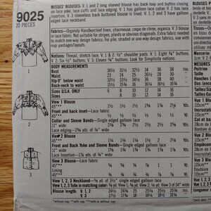 Suggested Fabrics - Organdy. Handkerchief linen, charmeuse, crepe de chine, organza. V. 3 blouse in lace fabric. Not suitable for stripes, plaids or obvious diagonals. Extra fabric needed to match one-way design fabrics. For pile, shaded or one-way design fabrics, use with nap yardages/layouts.