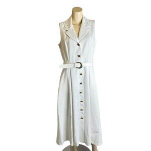 Vintage 80s White Button Down Midi Collared Sleeveless Dress Sz 14 Belted Studs