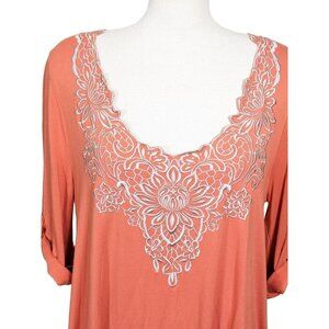 This vintage tunic top from Together is a must-have for any bohemian wardrobe. With a vibrant orange color and a floral embroidered design, this t-shirt is perfect for a casual or travel occasion. The scoop neckline and roll tab sleeves add a touch of elegance to the relaxed fit of the top. Made from a rayon blend material with added stretch, it is comfortable to wear and suitable for all seasons. The 3/4 sleeves make it a versatile piece that can be worn in winter, summer, fall, or spring. This tunic top is a great addition to any artsy or hippie style and is sure to turn heads.